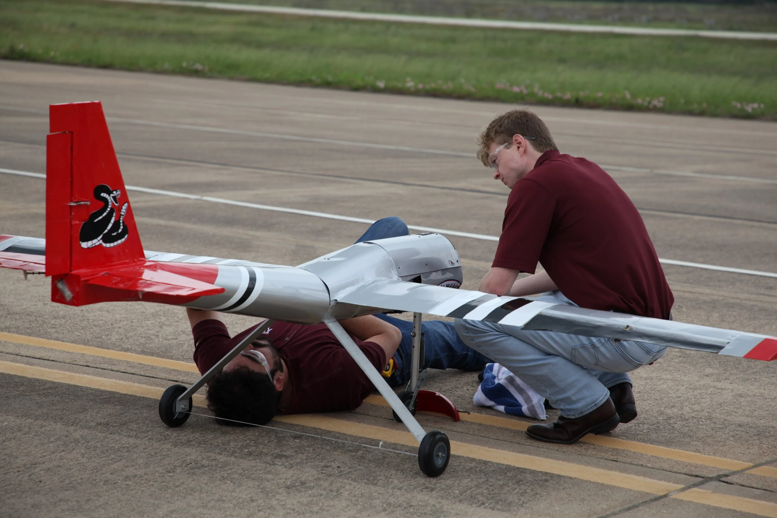 Project Rattlesnake is a long range, high endurance ISR UAV. It has a 9 ft wingspan, measures 5 1/2 ft from propeller to tail, and is constructed from 1/4 and 1/8 inch poplar plywood, basswood, balsa, and birch. The outer wings are detachable to allow for transport to Texas A&M Rellis Runway.
